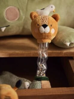 - Sur le dessus : lion à empiler en 5 parties, boulier avec chiffres « 1 2 3 » et zèbre dans un labyrinthe qui tourne autour du boulier