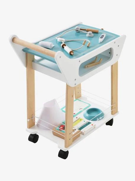 - Contient : 1 chariot, 1 collerette, 1 stéthoscope, 1 seringue à pousser, 1 pince, 1 bandage, des croquettes, 1 gamelle, 1 thermomètre, otoscope, planning de RDV, 3 boîtes de médicaments
