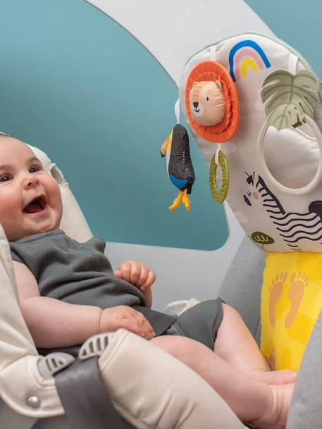 - Fixation facile grâce Ă un système de scratch et de sangles. Le centre d’activitĂ©s s’ajuste Ă la portĂ©e de bĂ©bĂ© pour lui permettre de jouer.