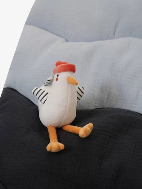 - Jouets attachés au tapis : phoque avec lien en velours et coton, poisson attaché avec lien sur tapis en velours et coton avec pouet pouet, mouette en velours et coton avec clochette, 3 anneaux plastiques de couleurs, 1 anneau transparent avec billes de couleurs, drapeaux et rubans en velours, miroir, bouchon attaché par lien en coton et velours