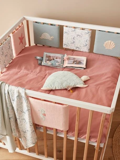 Côté parents, on apprécie de créer un joli petit nid douillet avec le tour de lit / tour de parc Sous l’Océan. Gaze de coton, jolis motifs, détails irisés : rien n’est trop beau pour votre bébé !